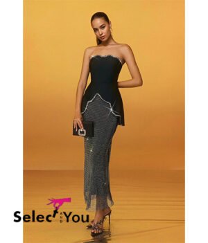 Black Strapless Two-Piece Rhinestone Mesh Maxi Dress
