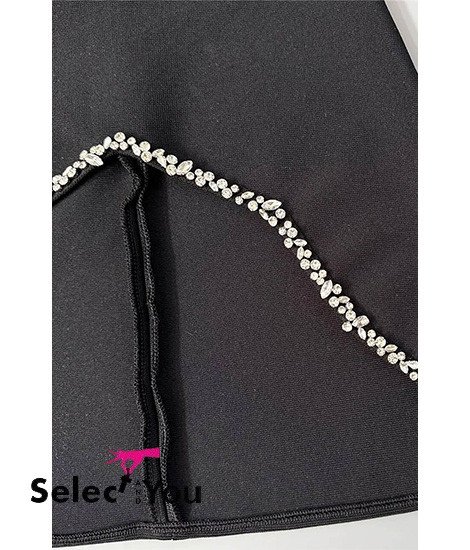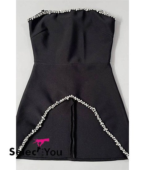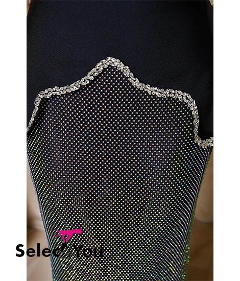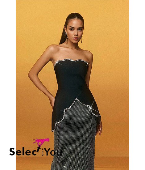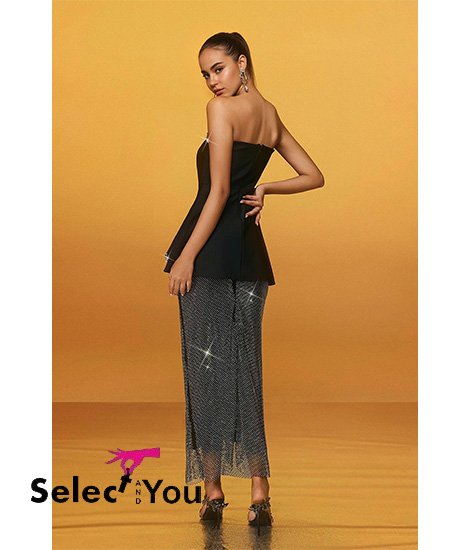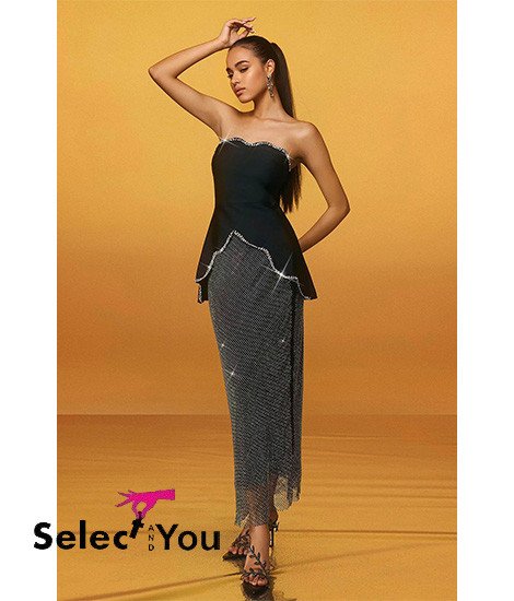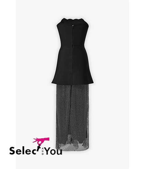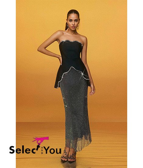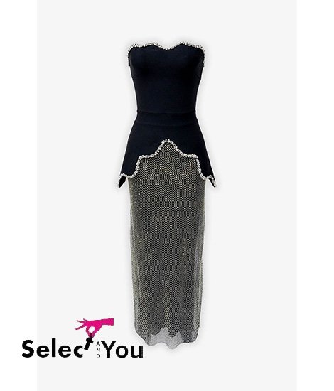 Black Strapless Two-Piece Rhinestone Mesh Maxi Dress